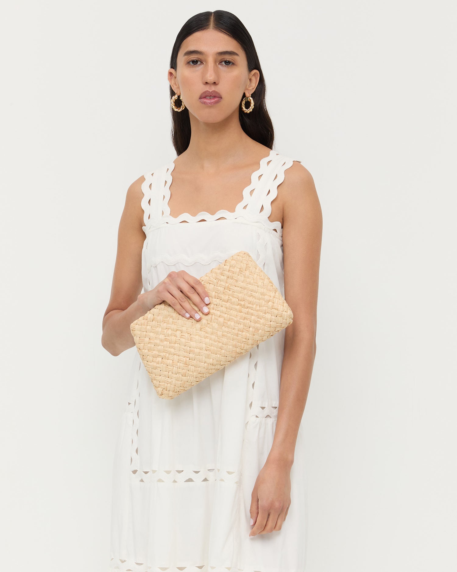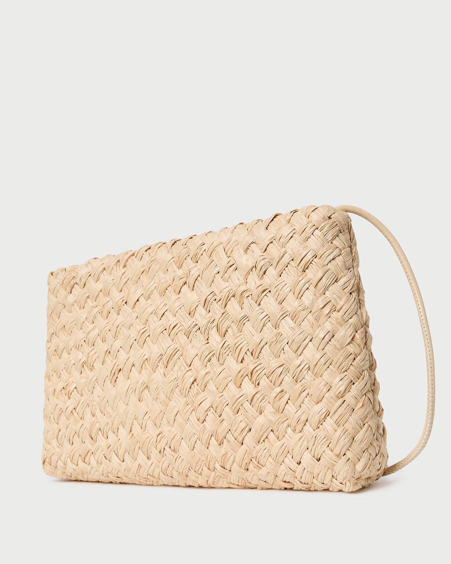 Clutch in natural woven straw. Features a removable shoulder strap, full lining, and magnetic closure.