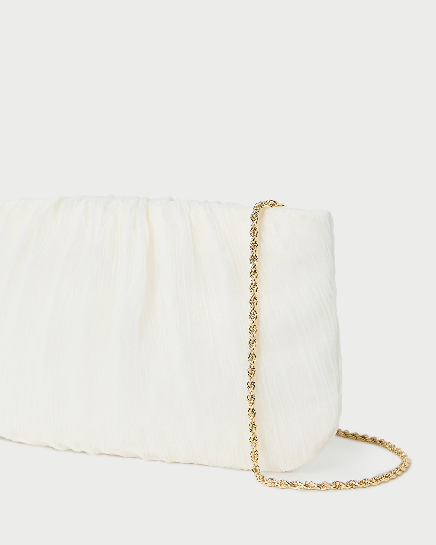 Flat pleated pouch in pearl white organza. Features a removable twisted gold metal chain strap, frame closure, full lining, and interior card slot.