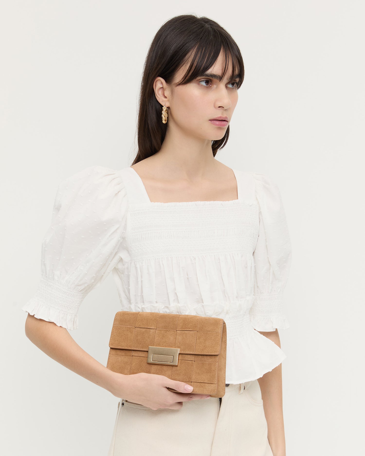 Shoulder bag in toffee brown woven suede. Features a slim strap, push lock closure, full lining, and gold stamped logo.