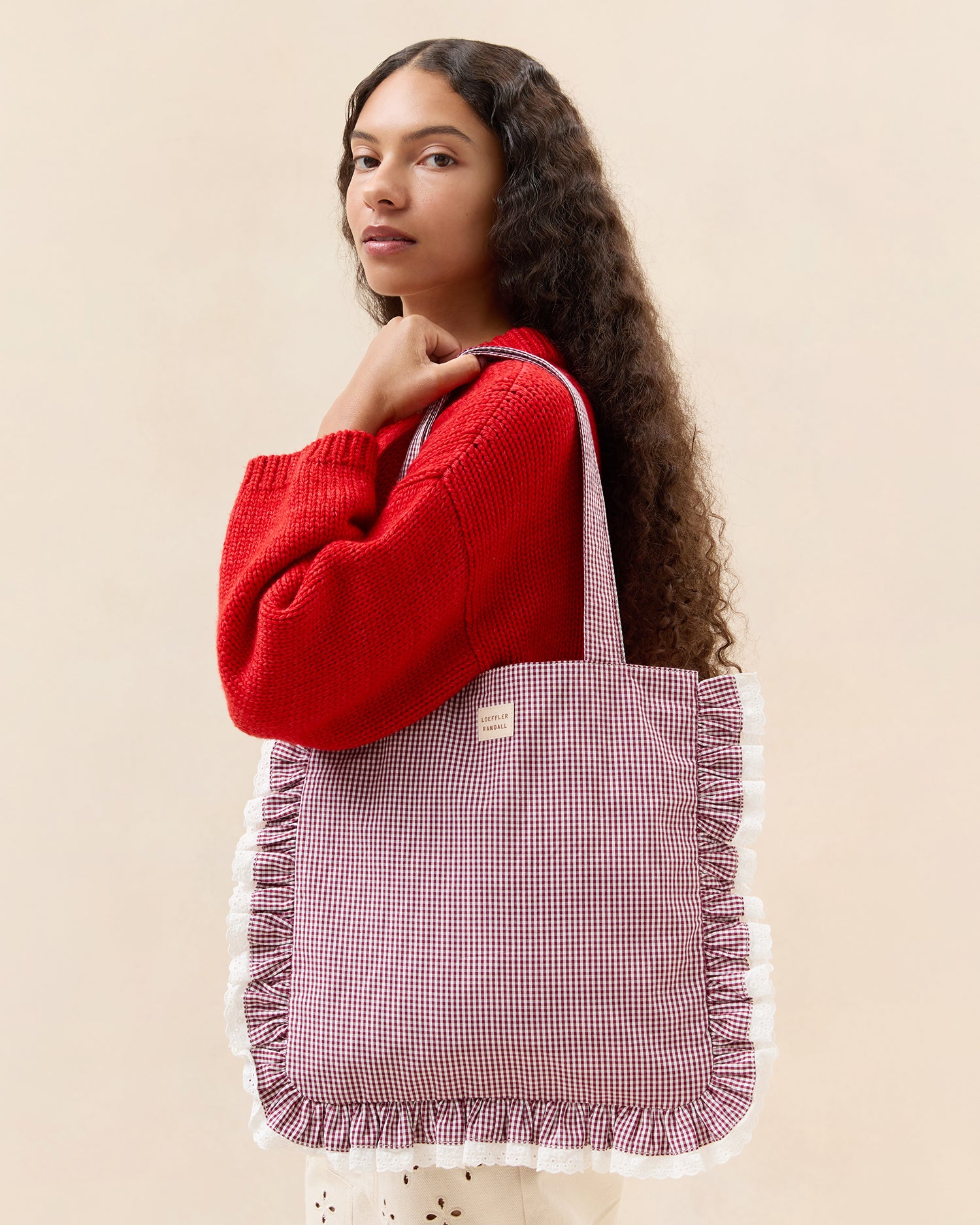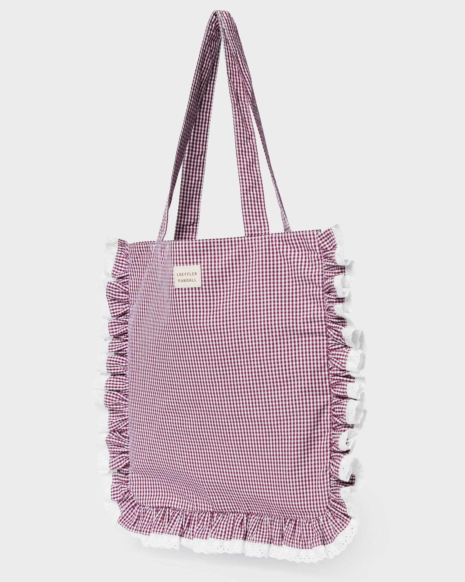 Tote bag in mini maroon gingham cotton with white ruffle trim. Features an exterior cotton logo patch and shoulder straps.