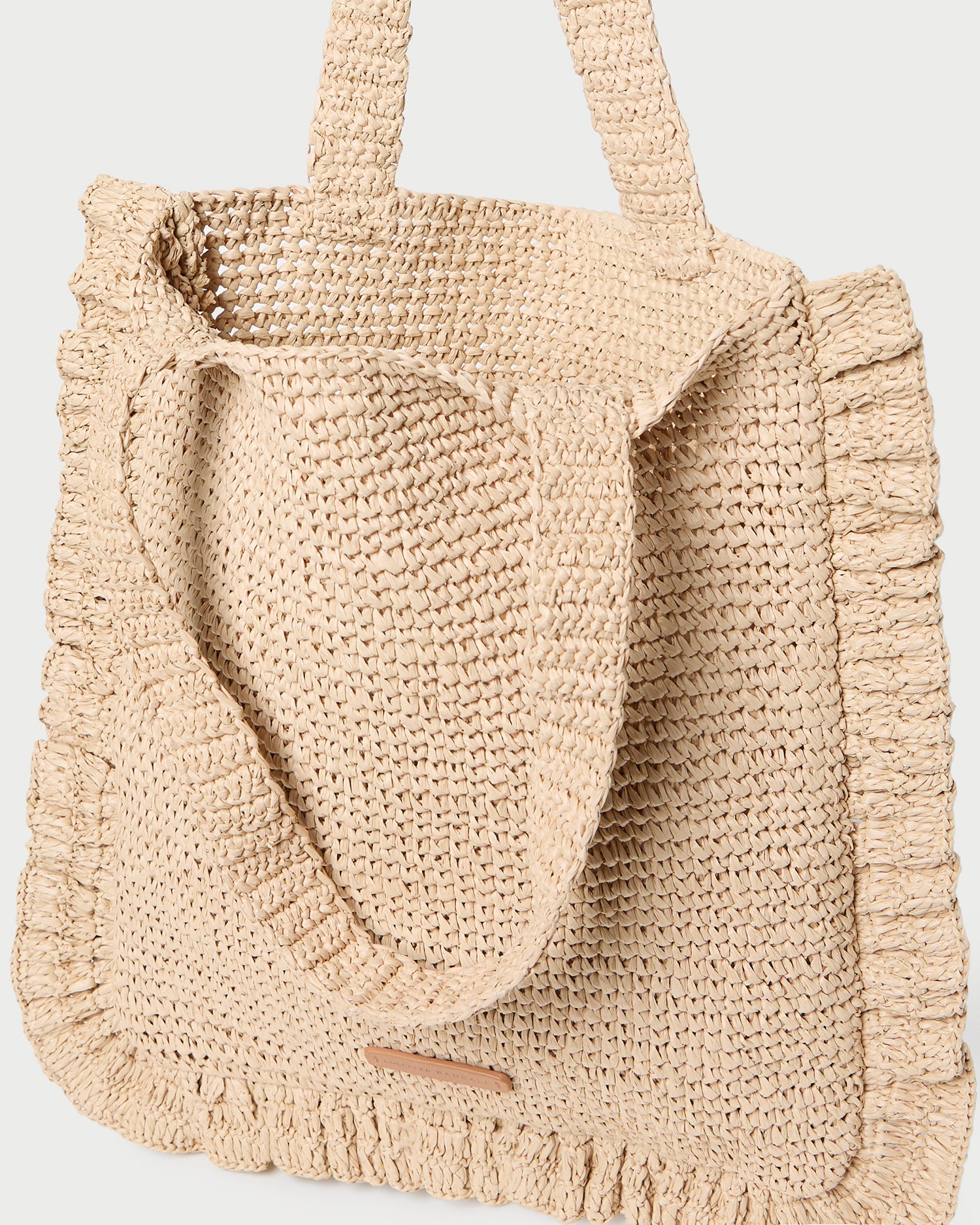 Tote bag in natural crocheted raffia with a ruffle trim. Features shoulder straps and an exterior cotton logo patch.