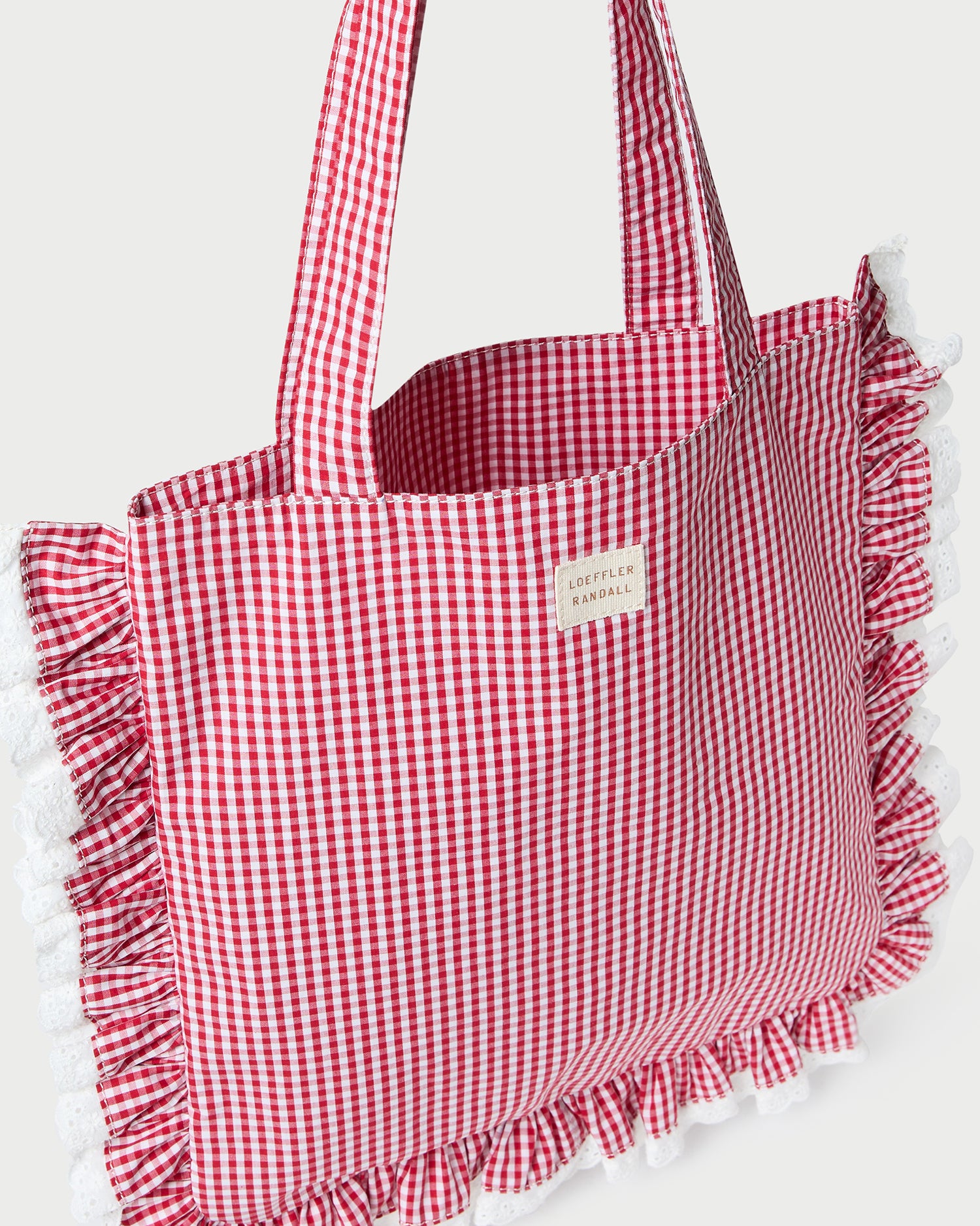 Tote bag in red gingham cotton with cream ruffled broderie trime. Features shoulder straps and an exterior cotton logo patch.