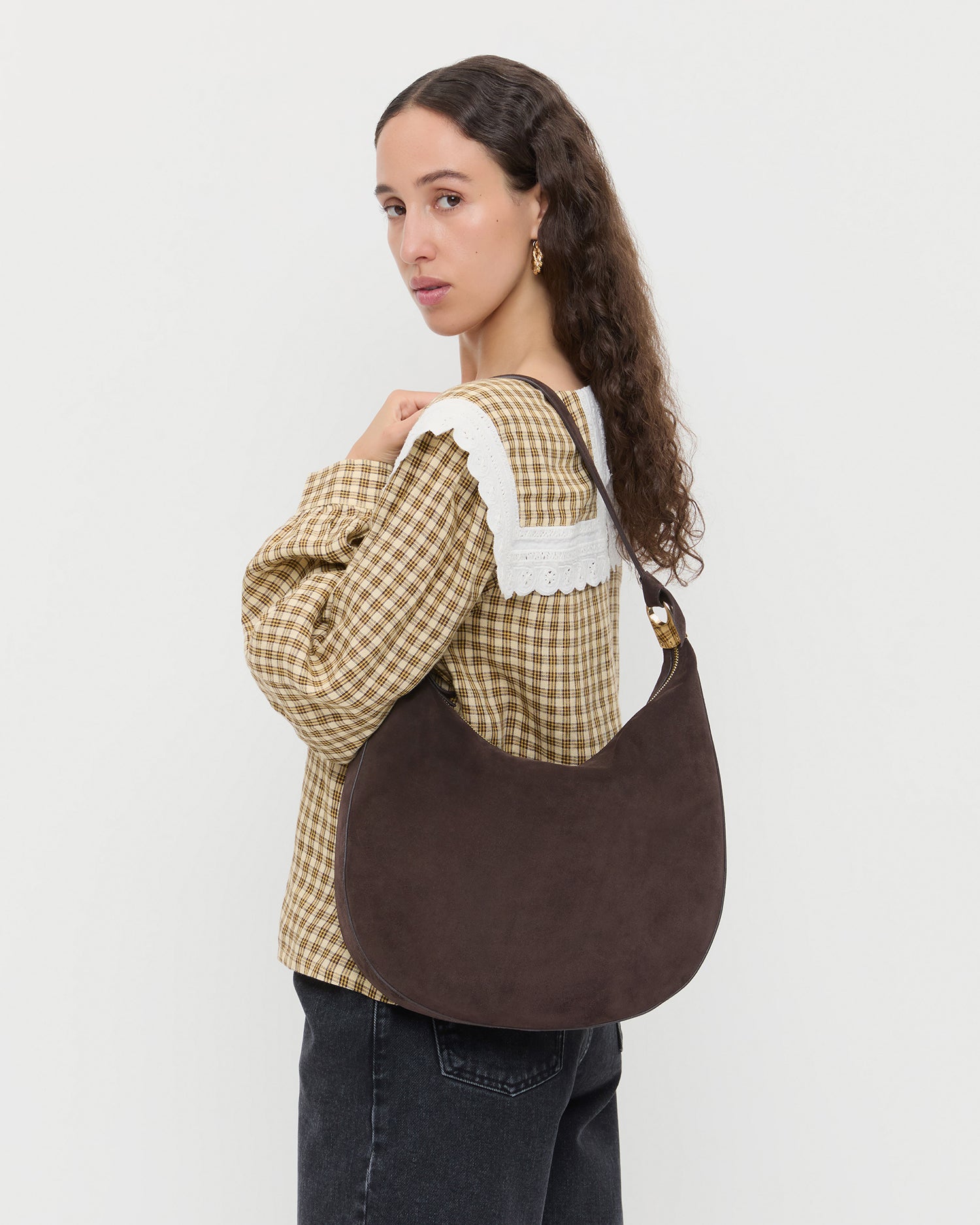 Hobo bag in brown suede with gold hardware. Features a simple shoulder strap, top zip closure, interior pocket, and an exterior leather stamped logo.
