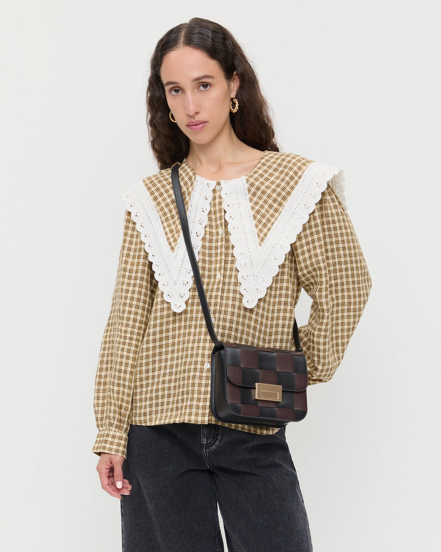 Crossbody in black and espresso wide woven vachetta leather. Features an adjustable strap, flap design, push lock closure, full lining, and gold stamped logo.