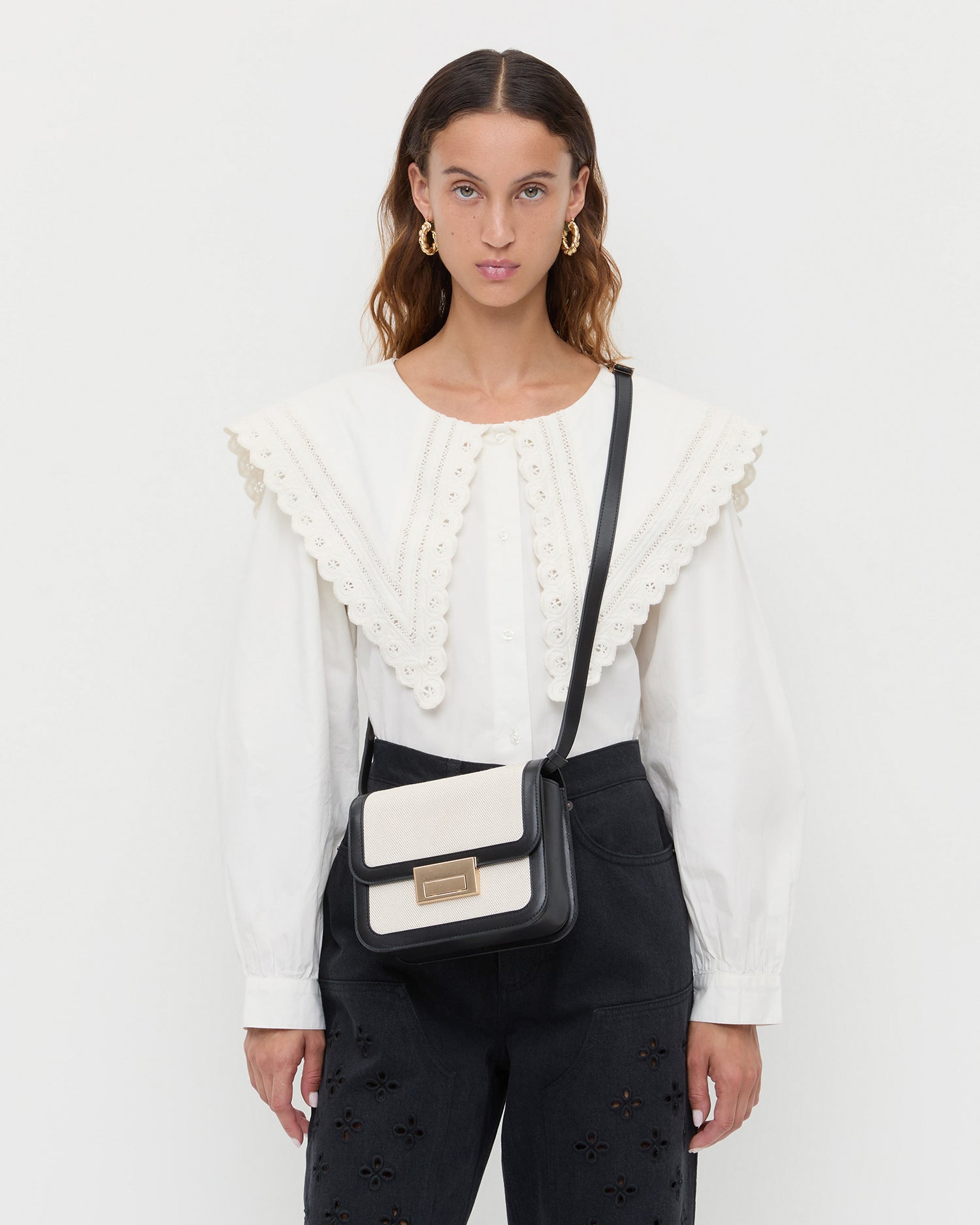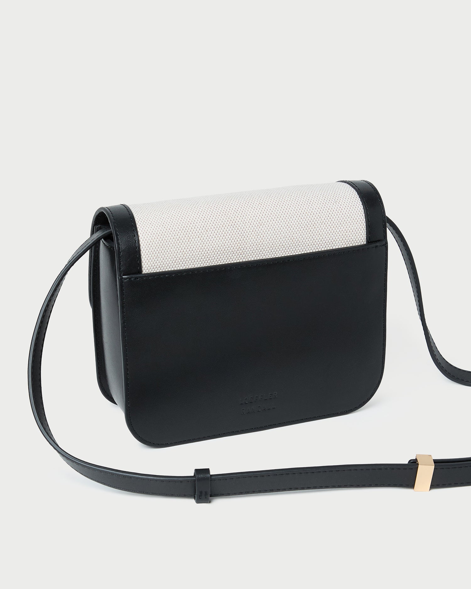 Crossbody in natural canvas with black vachetta leather trim. Features an adjustable strap, flap design, push lock closure, full lining, and gold stamped logo.