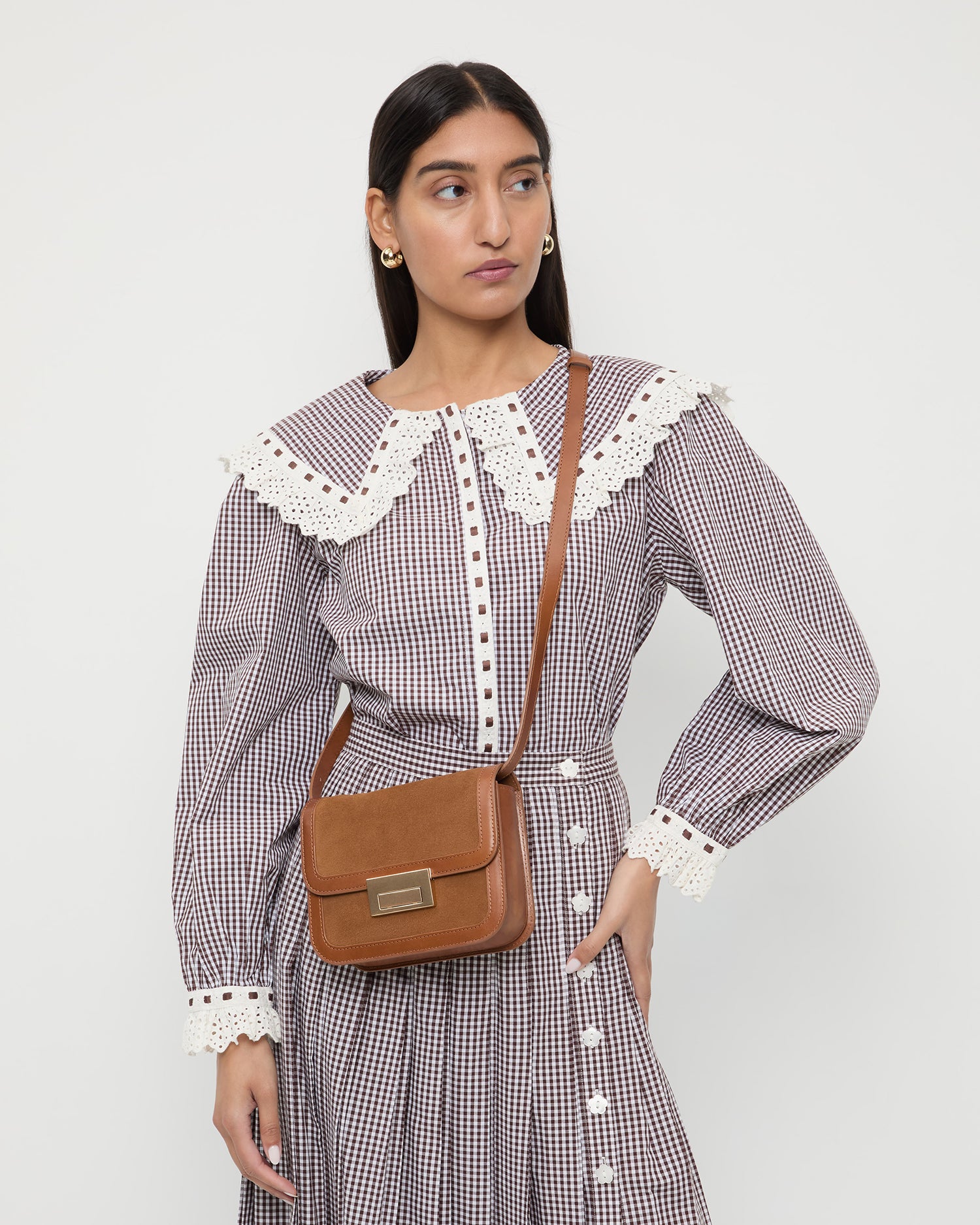 Crossbody in cacao brown suede with a vachetta leather. Features a tonal strap, flap design, push lock closure, full lining, and gold stamped logo.