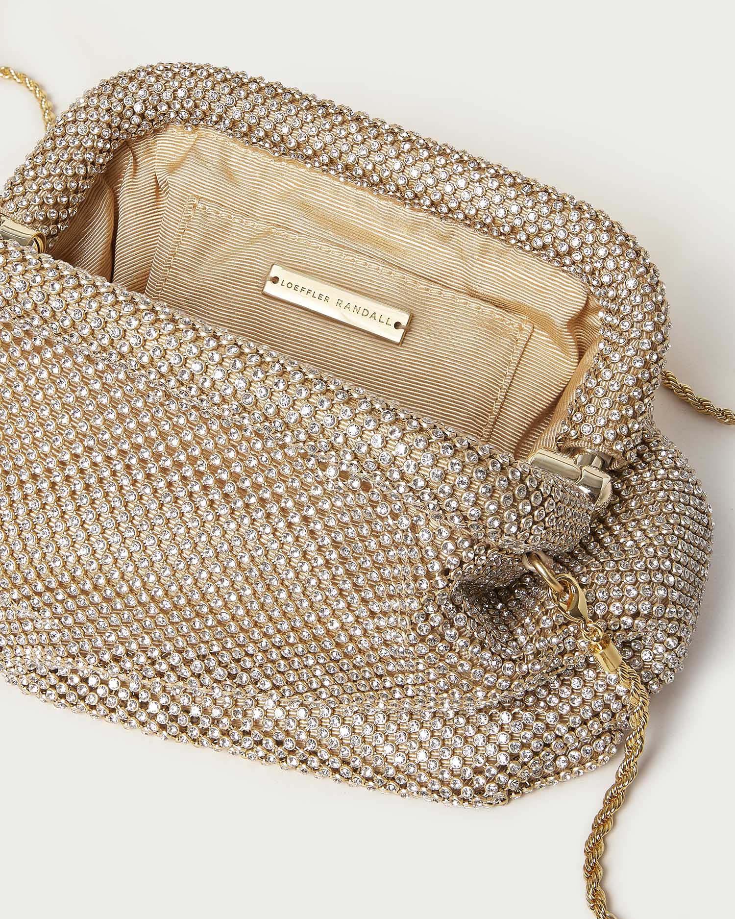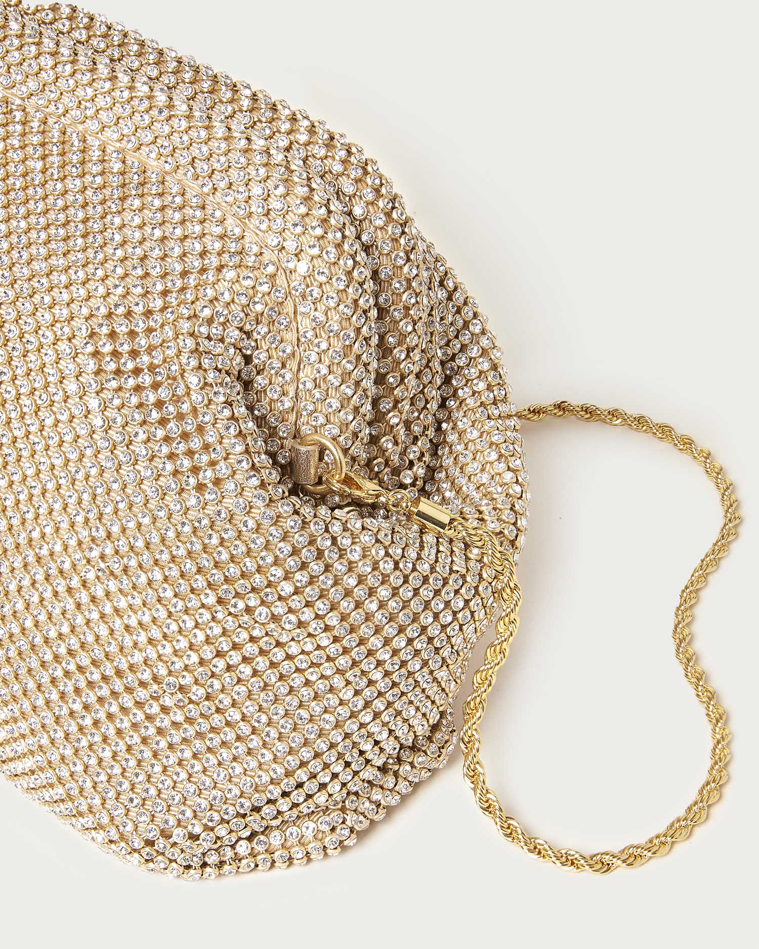 Frame pouch in gold diamanté mesh. Features a removable twisted gold metal chain strap, frame closure, full lining, and an interior slip pocket.