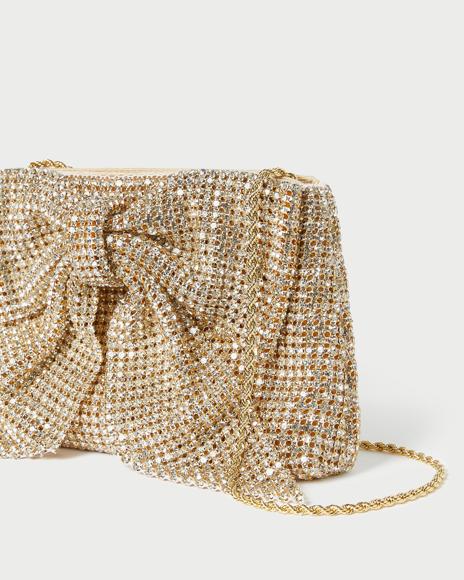 Pleated frame clutch in gold diamanté with a statement-making bow. Features a removable twisted gold chain shoulder strap, covered magnet closure, full lining, and logo plaque.