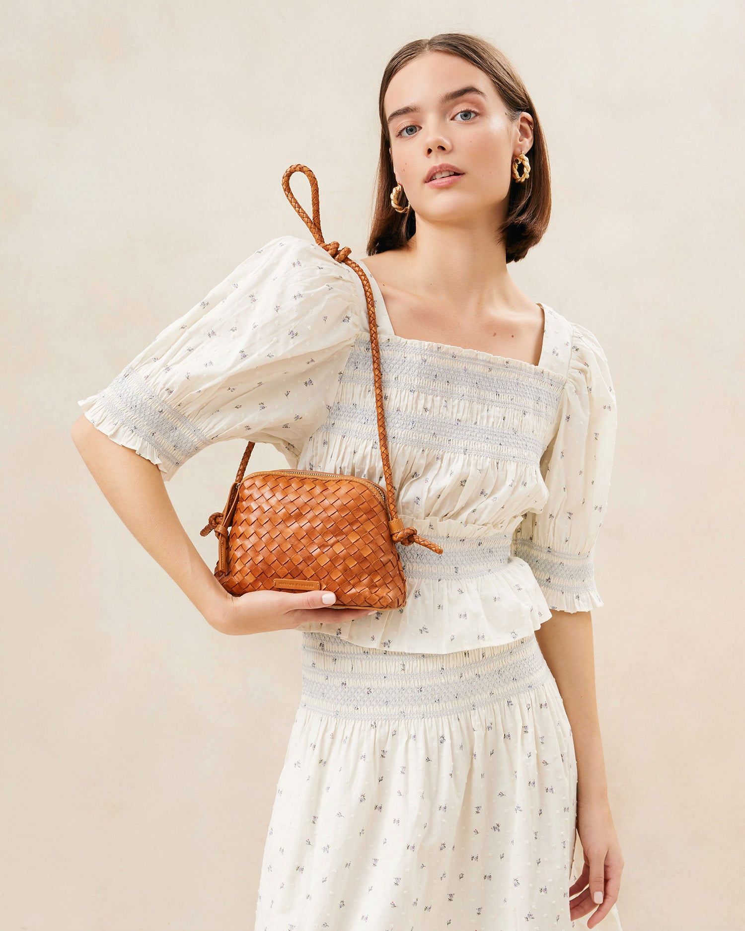 Mini crossbody bag in timber brown woven leather. Features a zipper closure, cotton lining, an interior pocket, and a stamped logo.