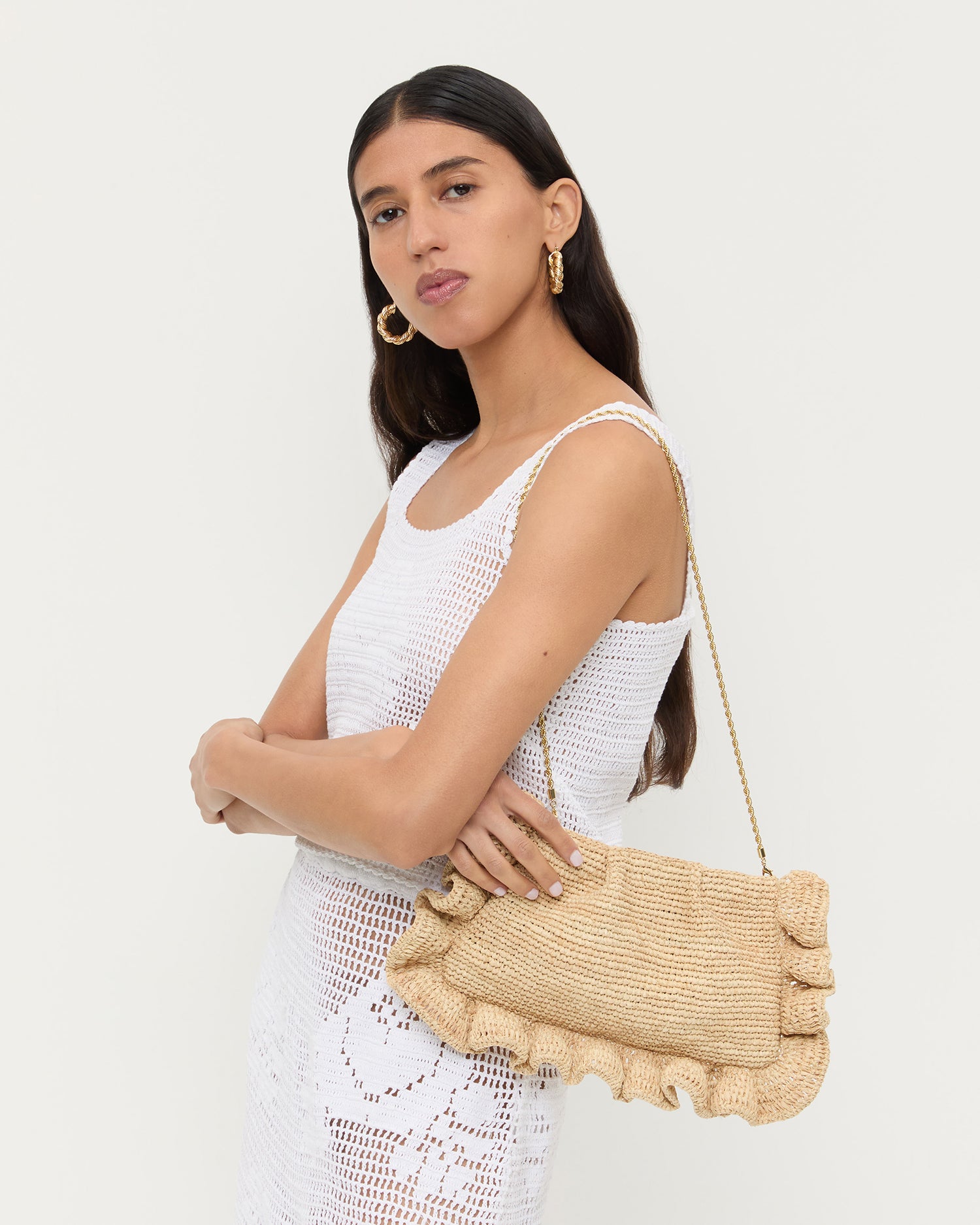 Clutch in natural crocheted raffia with ruffle detailing. Features a removable twisted gold chain strap, and frame closure.
