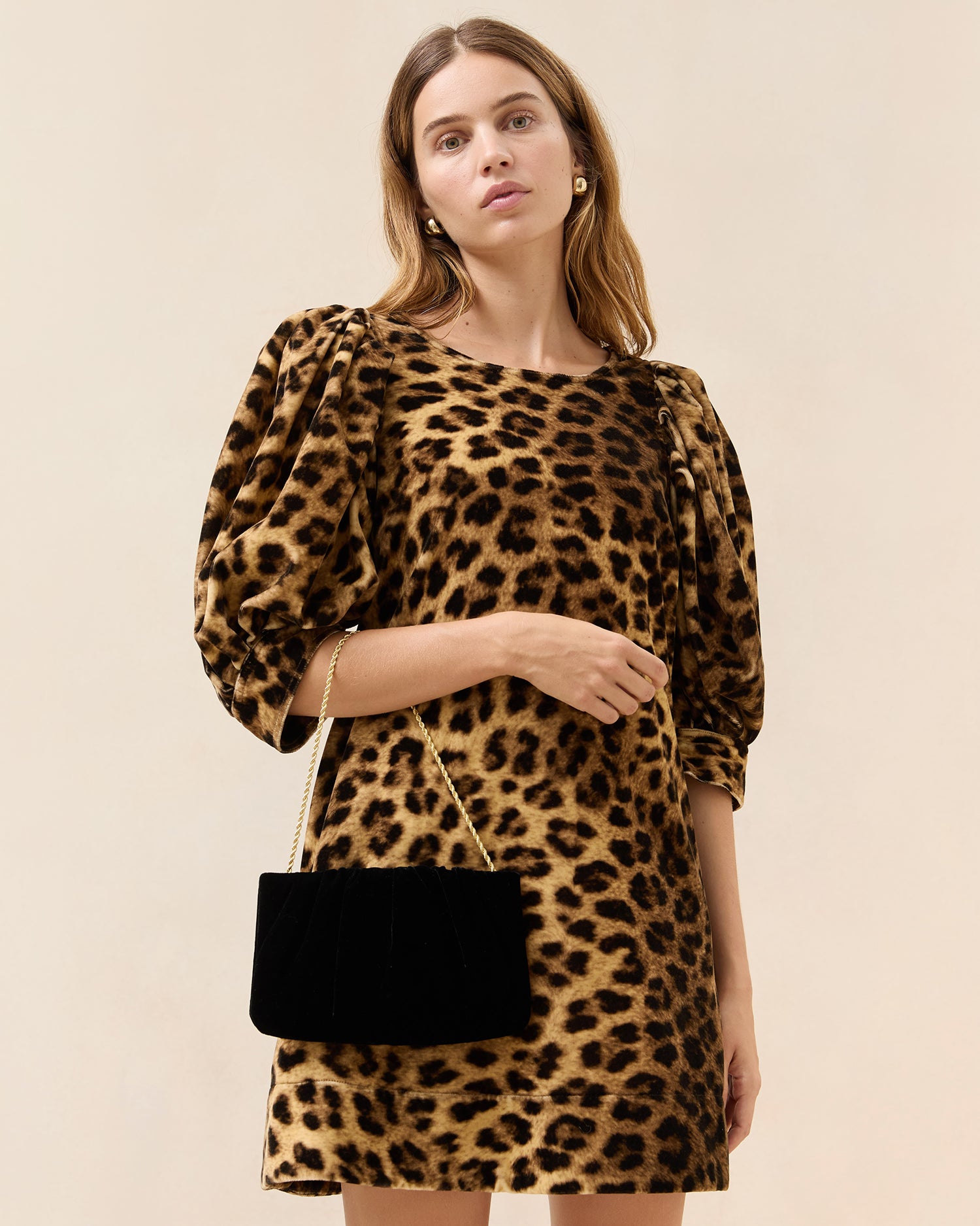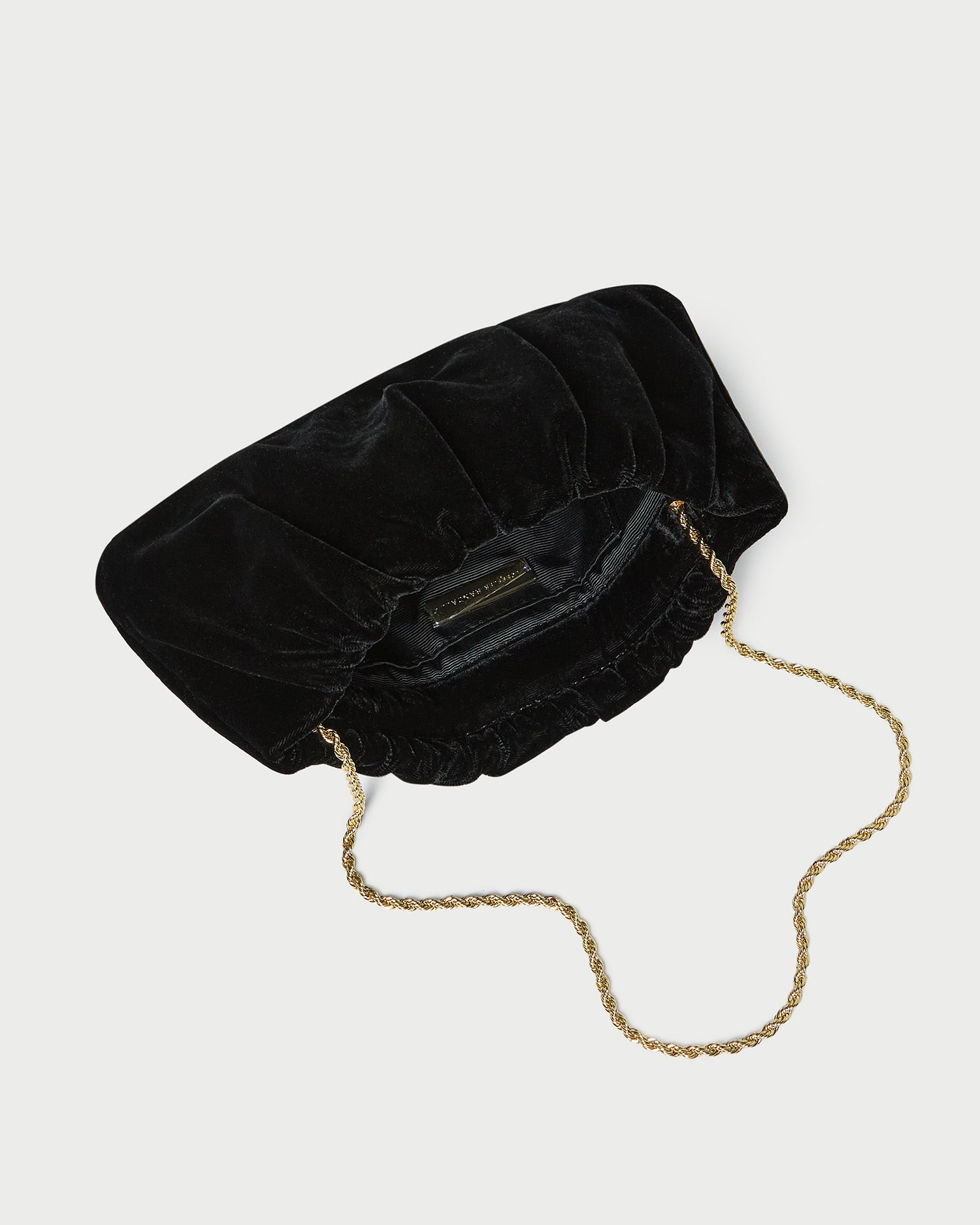 Gathered flat clutch in black velvet. Features a removable twisted gold chain strap, frame closure, full lining, and an interior metal logo plaque.