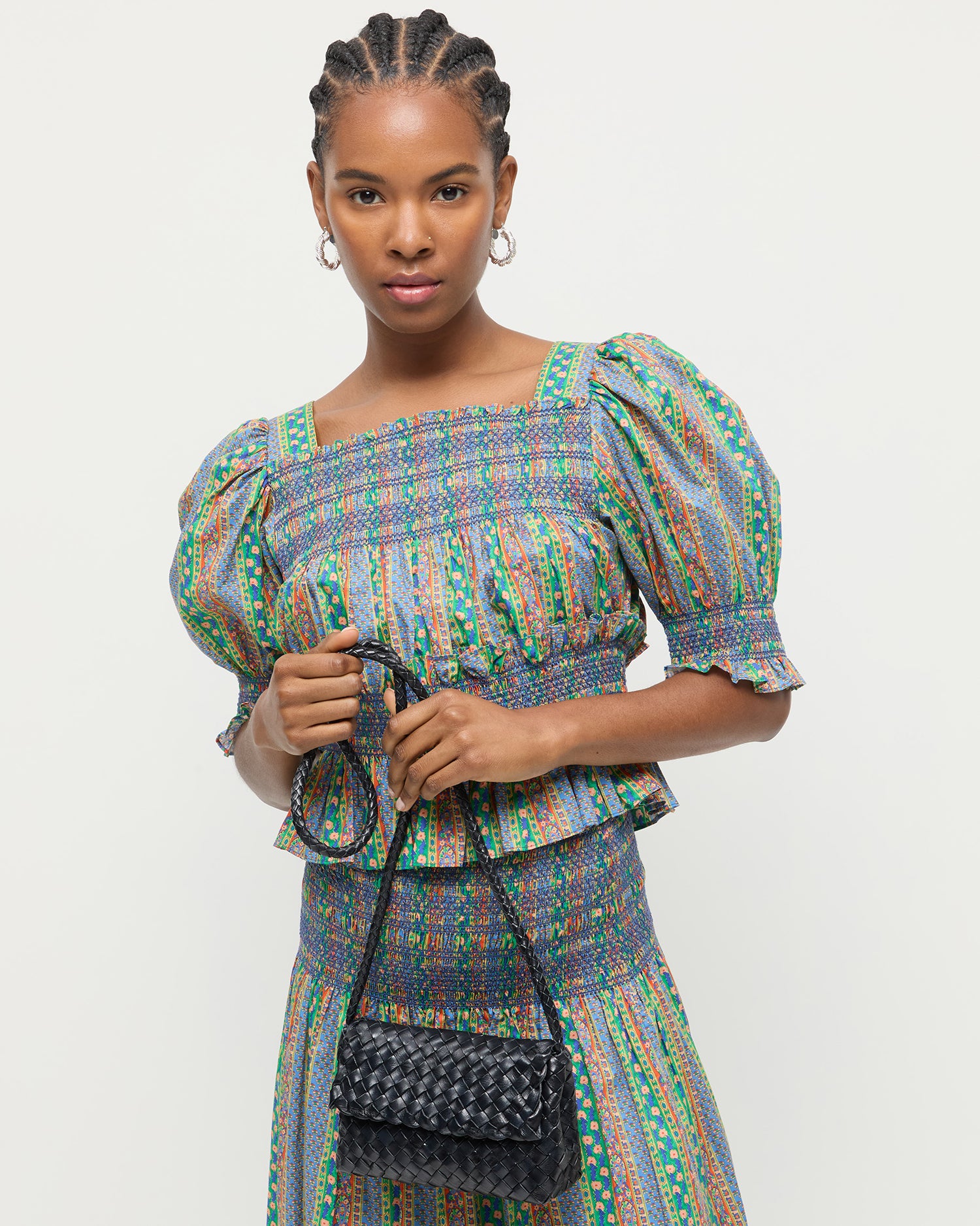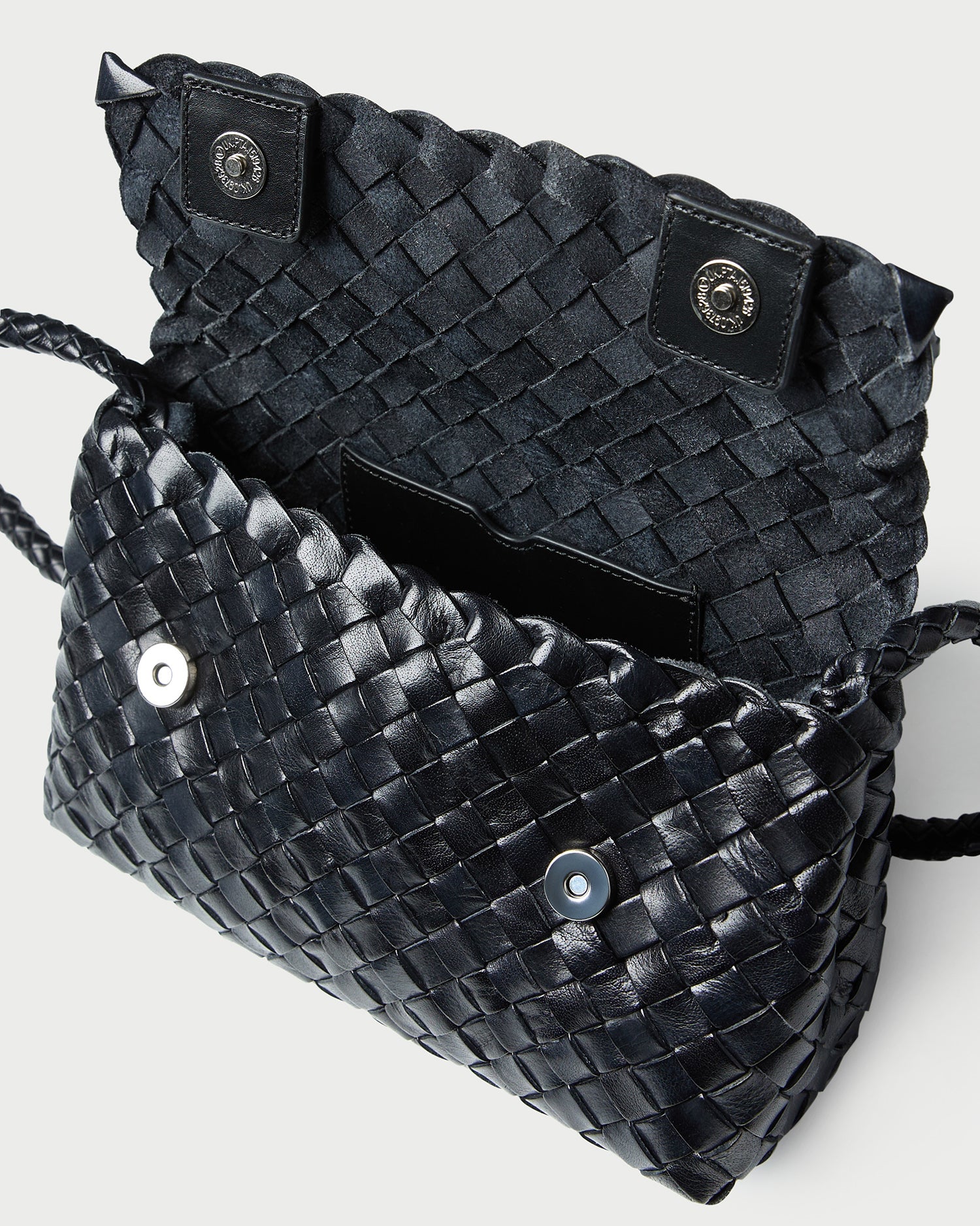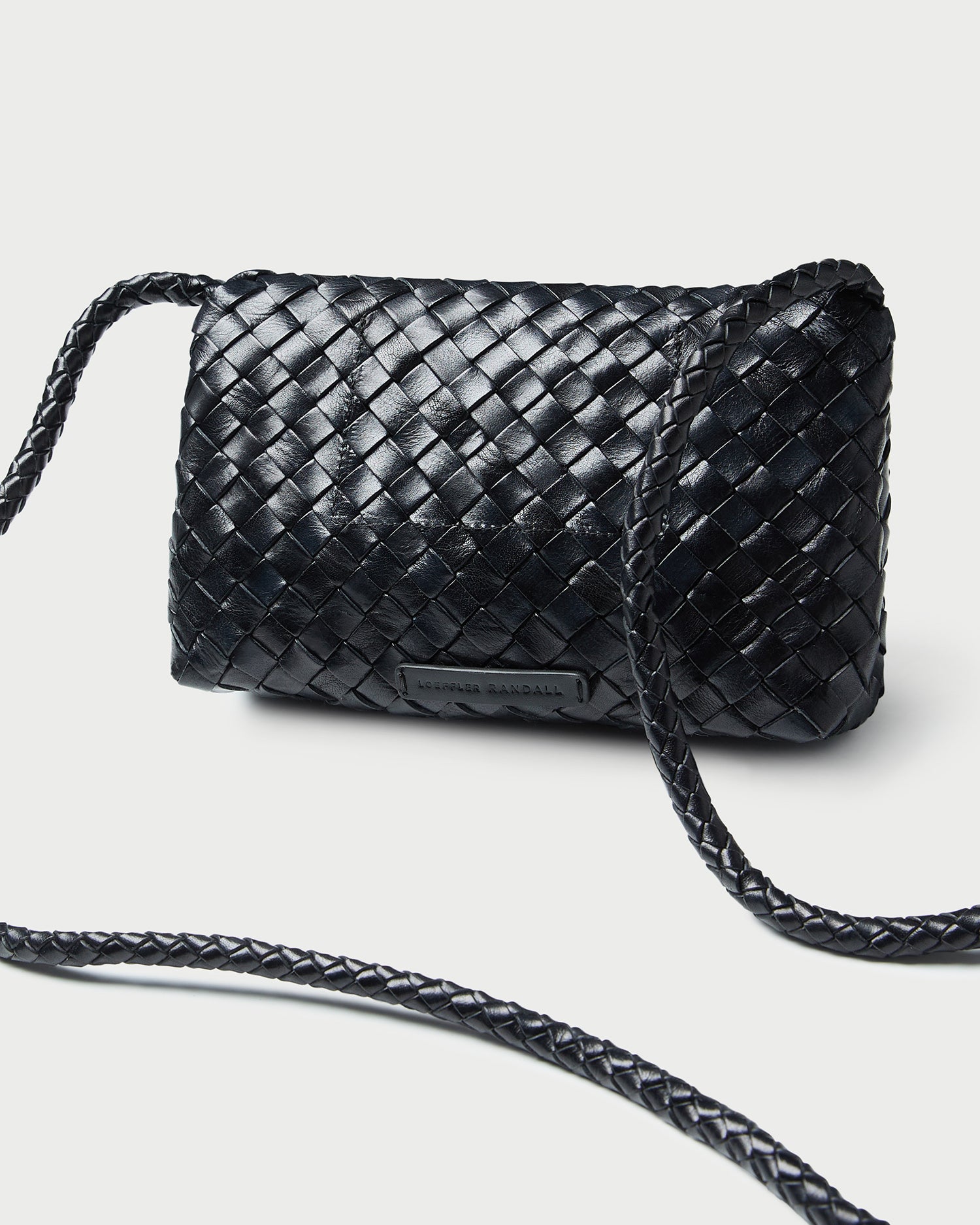 Crossbody bag in black woven leather. Features a magnetic flap closure, interior card slot, and a blind embossed leather logo patch.