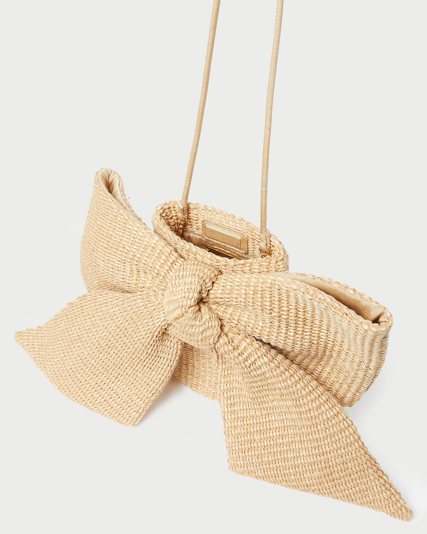 Evening crossbody bag in raffia-inspired woven fabric with an oversized bow. Features a magnetic closure and full lining.