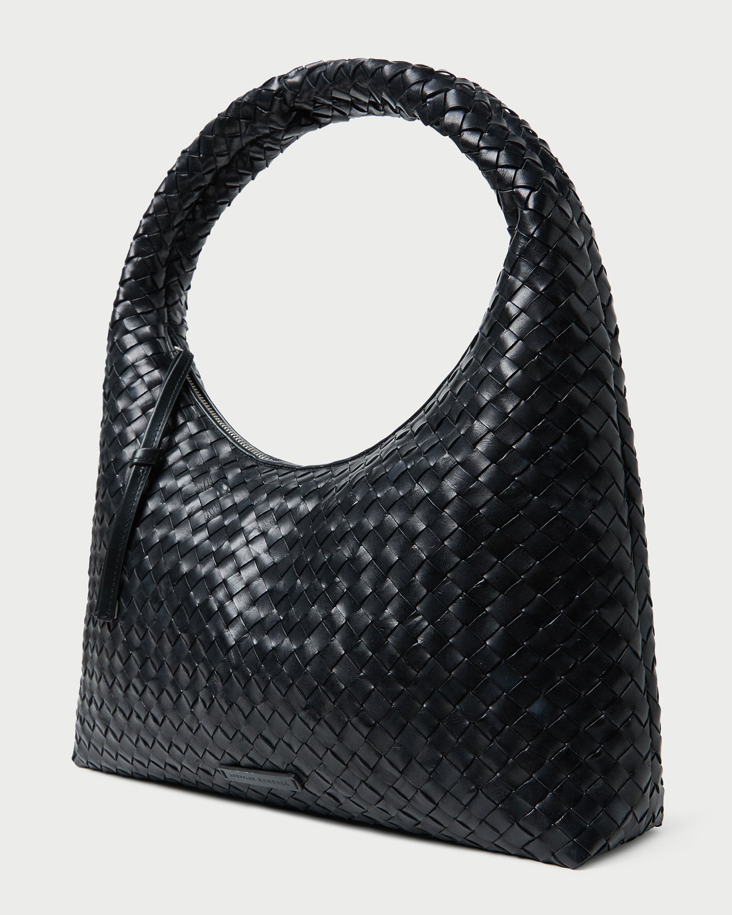 Hobo bag in black woven leather. Features a relaxed silhouette, a zipper closure, cotton lining, an interior zip pocket, and a blind embossed leather logo patch.