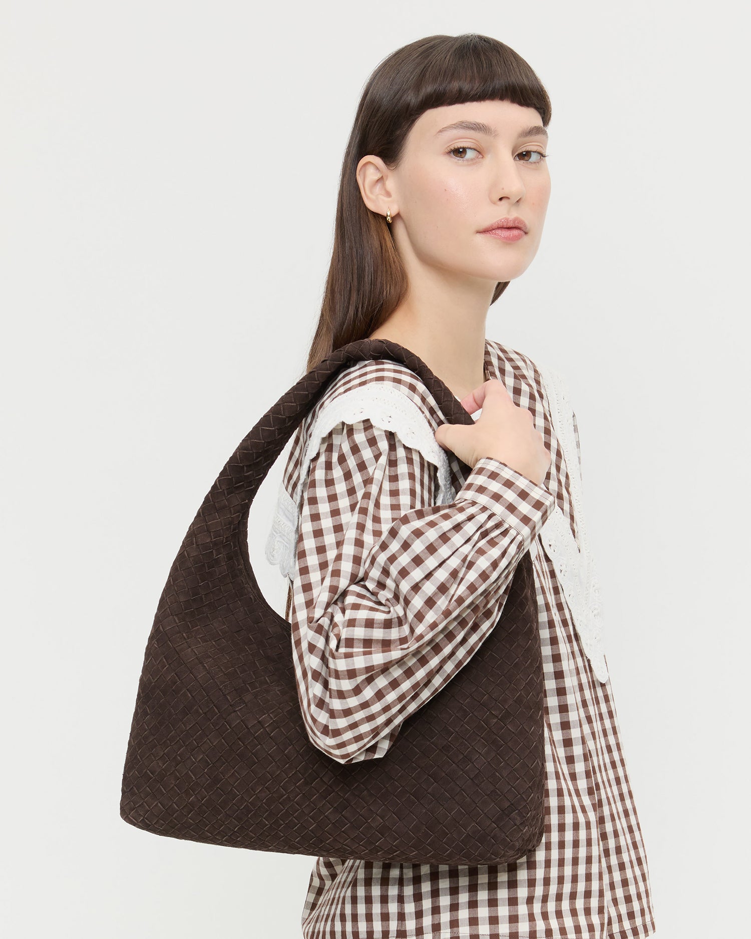 Hobo bag in brown woven suede. Features a relaxed silhouette, a zipper closure, cotton lining, interior zip pocket, and a blind embossed leather logo patch.