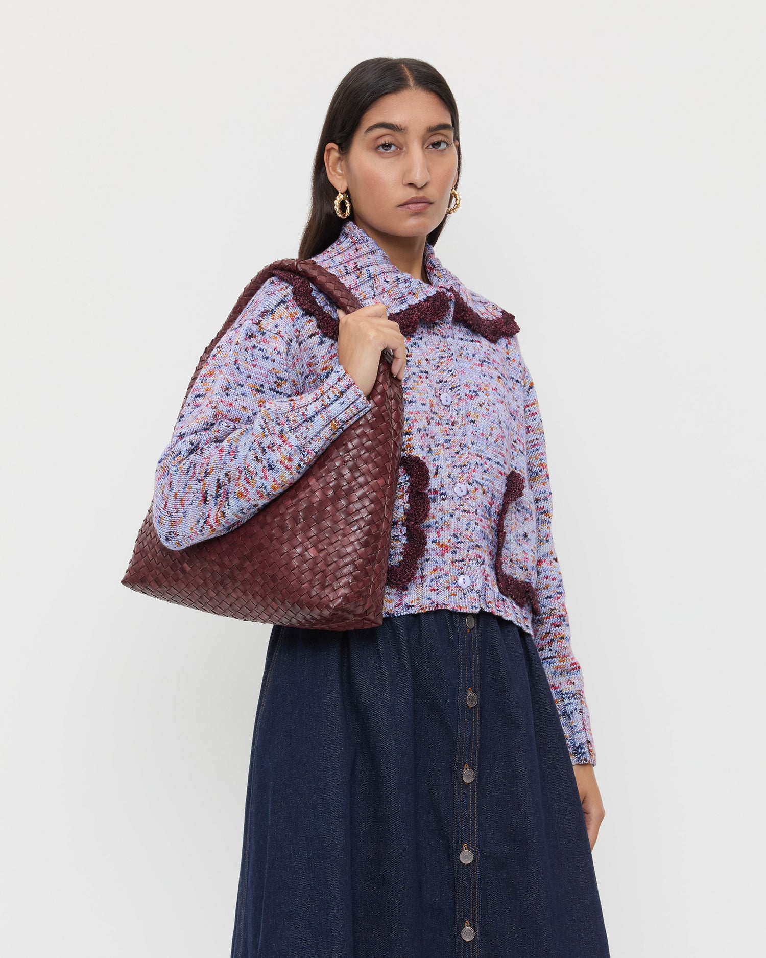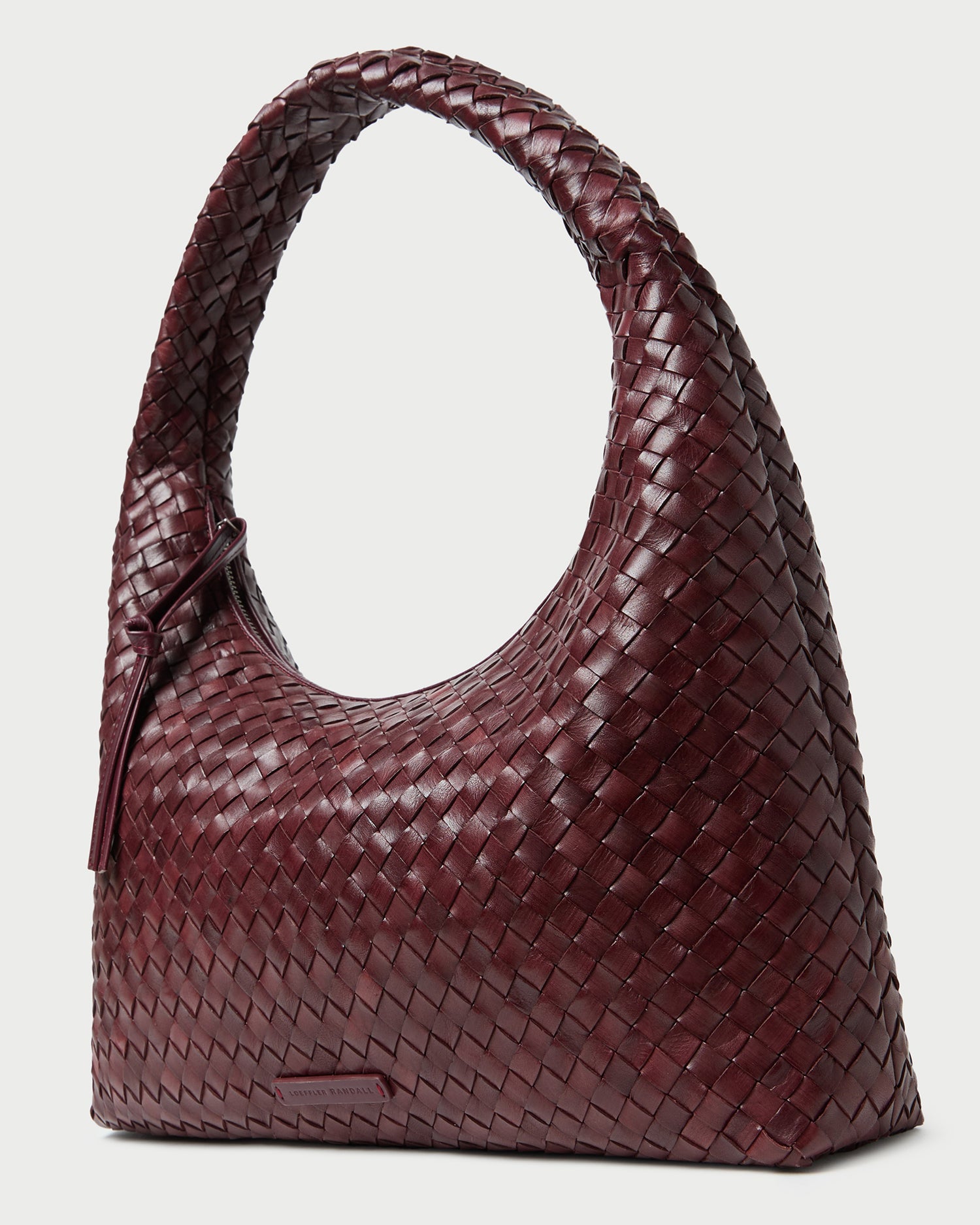 Hobo bag in maroon woven leather. Features a relaxed silhouette, a zipper closure, cotton lining, an interior zip pocket, and a blind embossed leather logo patch.