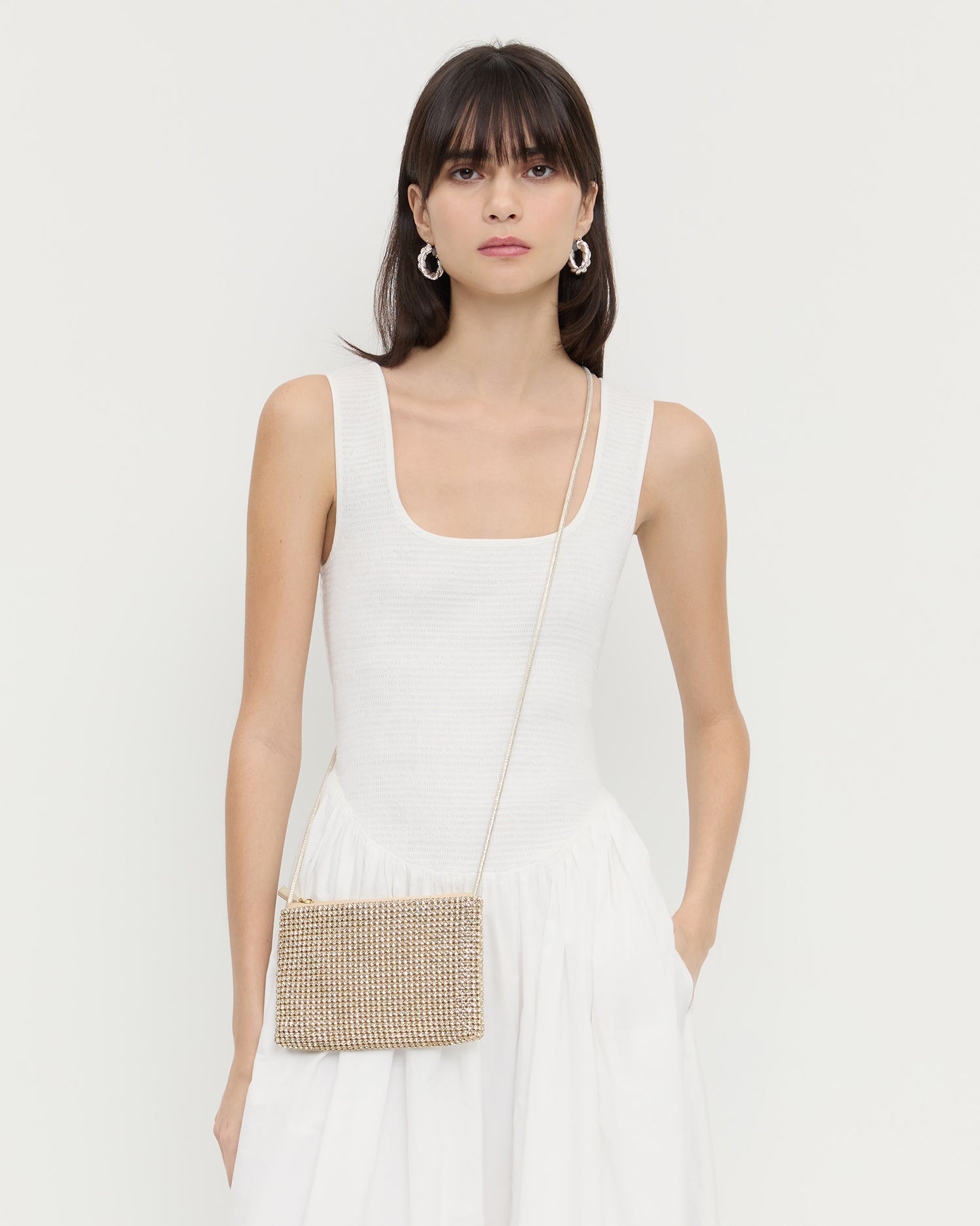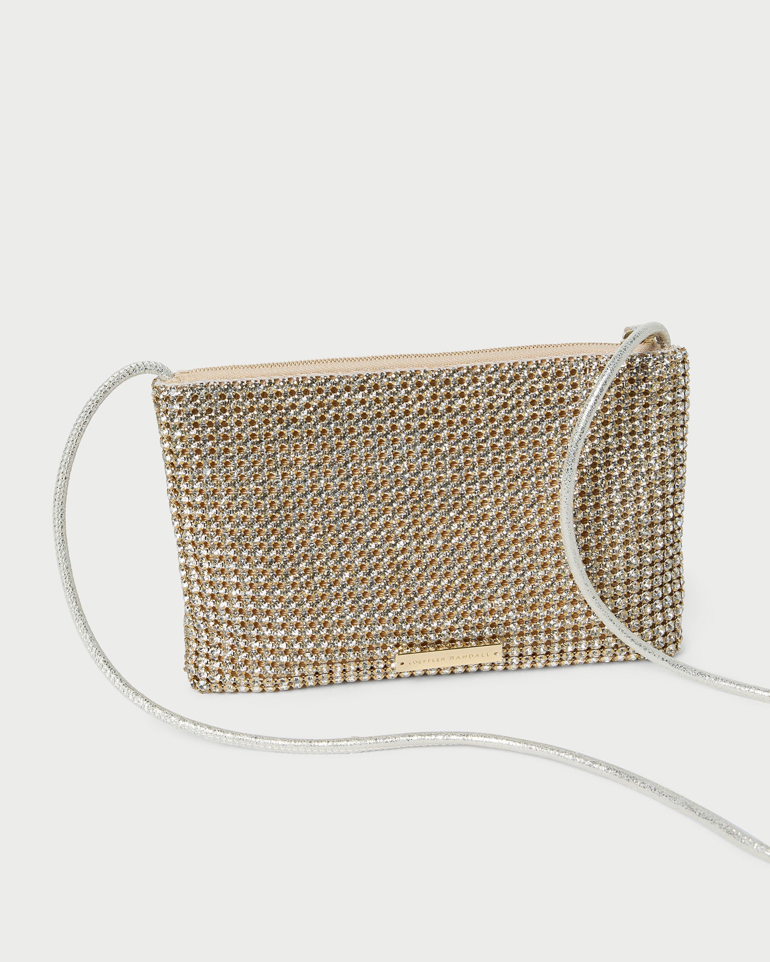 Compact crossbody in gold diamanté. Features a full lining, a zipper closure, and an exterior metal logo plaque.