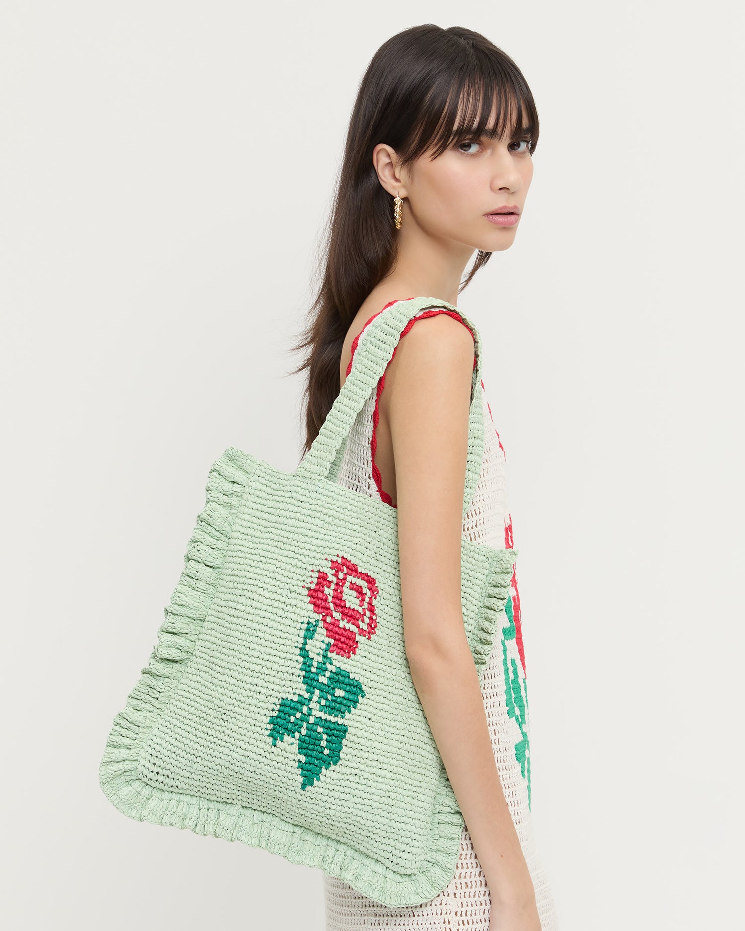 Tote bag in mint crocheted raffia with a red and green flower detail and a ruffle trim. Features shoulder straps and an exterior cotton logo patch.