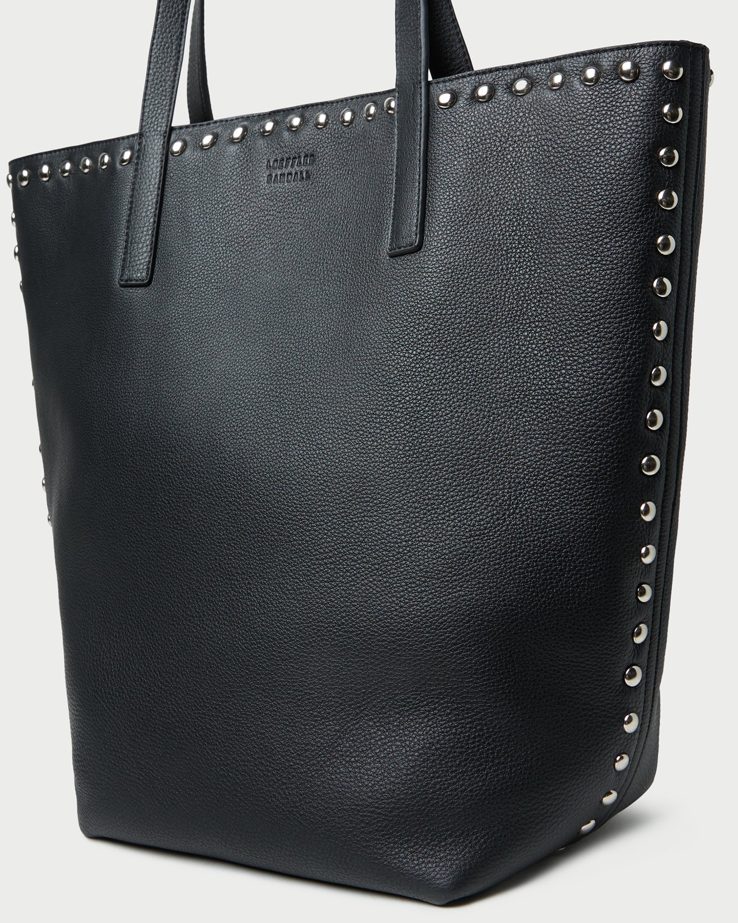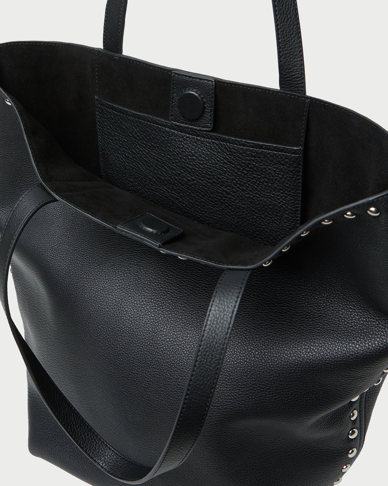 Tote bag in black pebbled leather with silver stud details. Features a magnetic closure and a hanging interior pocket.